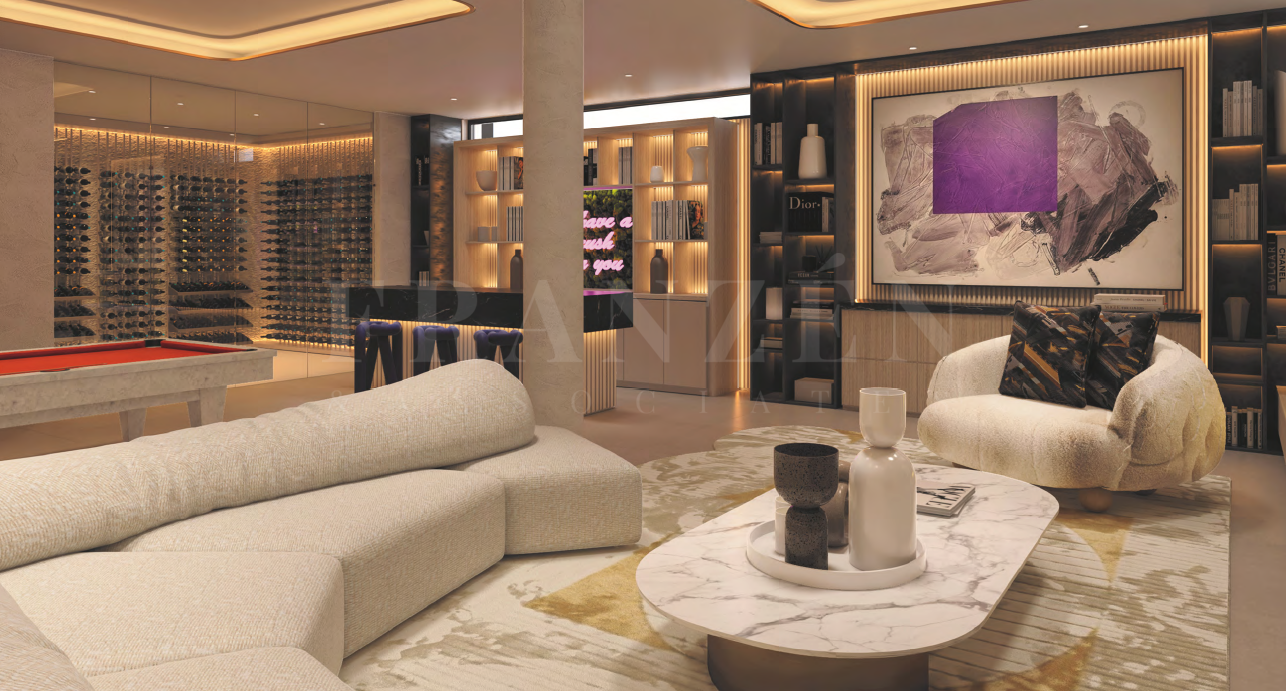 Los materiales seleccionados subrayan el carácter lujoso de la vivienda: suelos y revestimientos Porcelanosa de gran formato, carpintería interior de suelo a techo, carpintería exterior de alta eficiencia y armarios con elegantes frentes de vidrio ahumado. La cocina — diseñada exclusivamente para esta promoción por el reconocido interiorista Pedro Peña — está equipada con electrodomésticos Gaggenau de alta gama y ofrece varias opciones de personalización.
